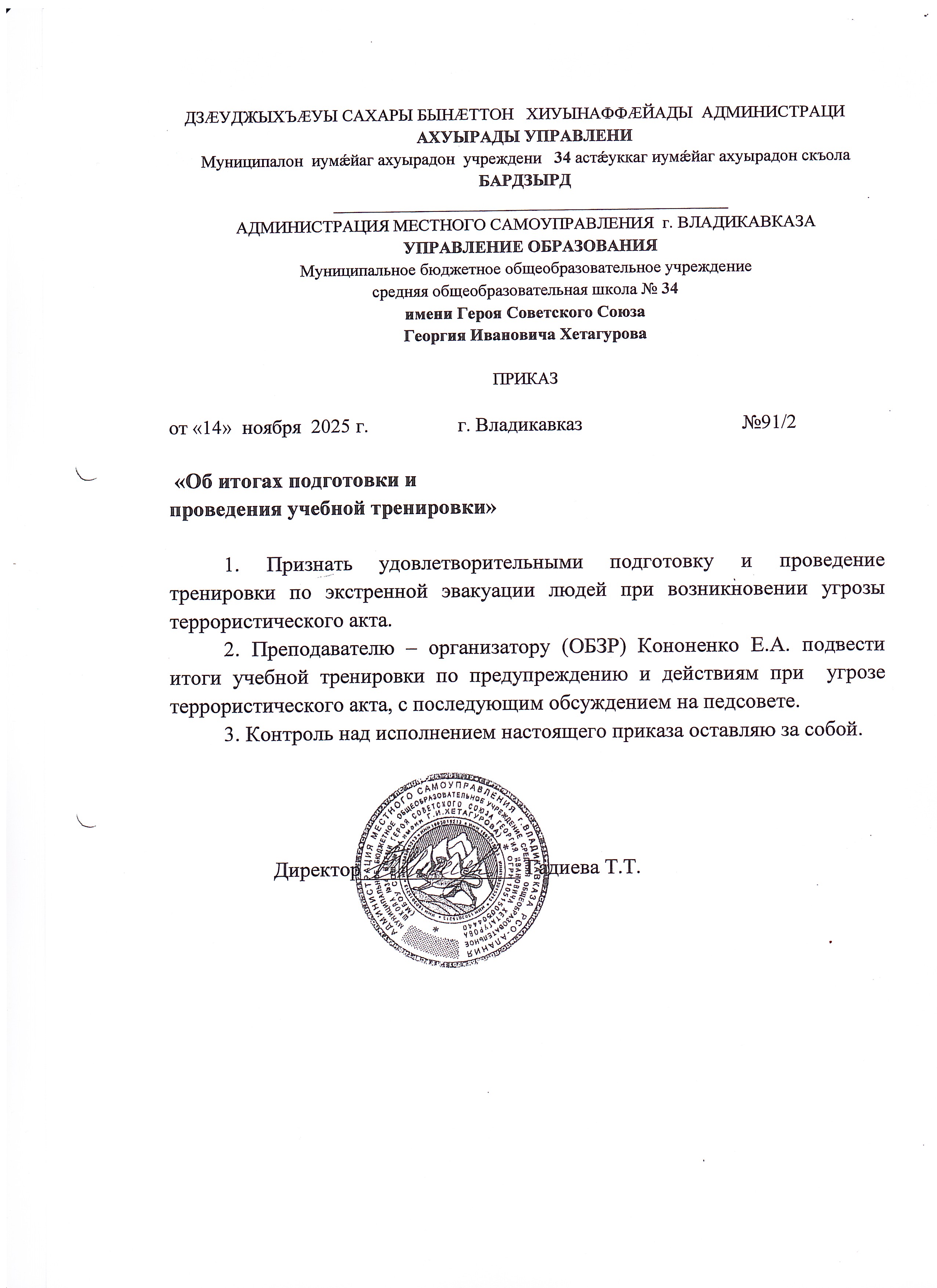 Приказ №91/2 "Об итогах подготовки и проведения учебной тренировки"