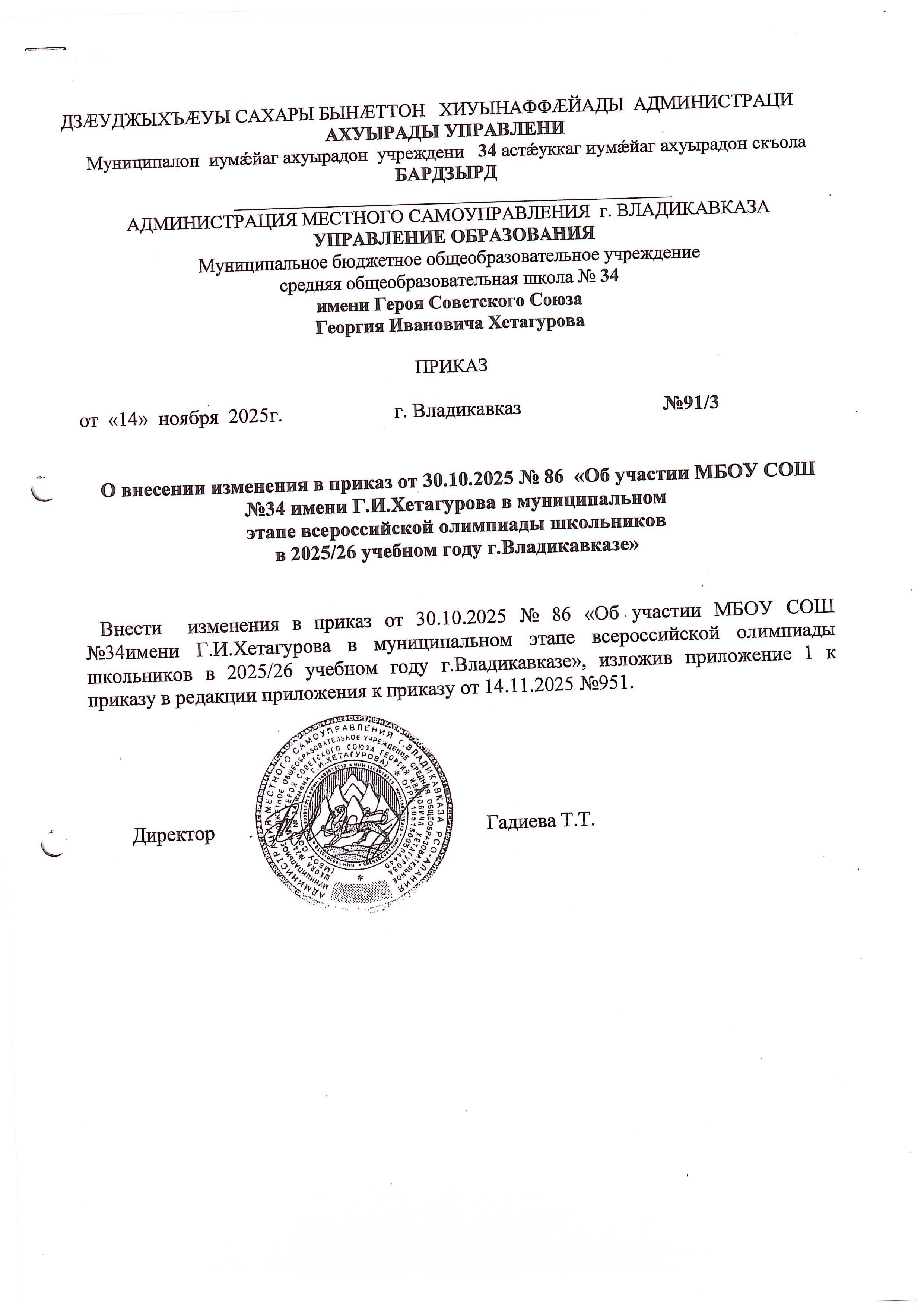 Приказ №91/3 "О внесении изменений в приказ от 30.10.2025 №86 "Об участии в муниципальном этапе ВСОШ"