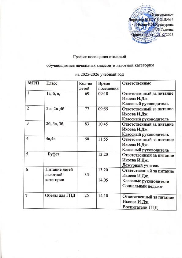 График посещения столовой обучающимися начальных классов и льготной категории на 2024-2025 учебный год