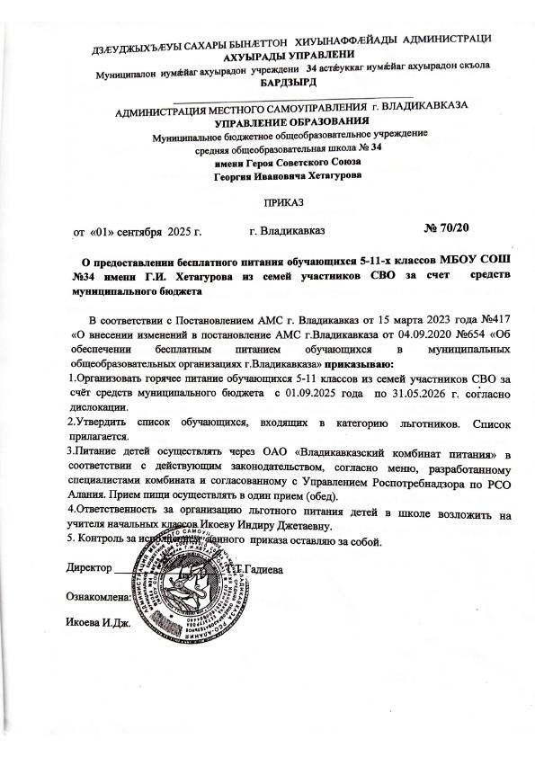Приказ №70/20 от 01.09.2025 "О предоставлении бесплатного питания обучающихся 5-11 классов из семей участников СВО за счет средств муниципального бюджета"