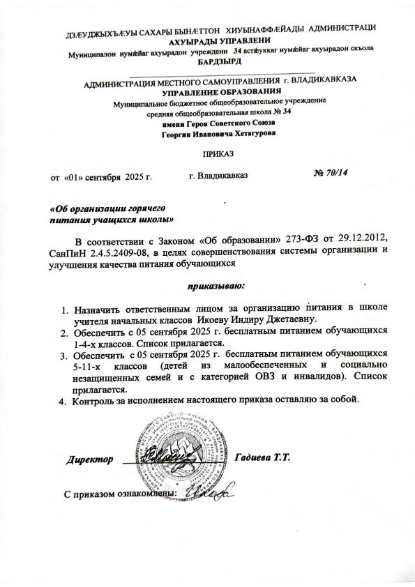 Приказ №70/14 от 01.09.2025 "Об организации горячего питания учащихся школы"