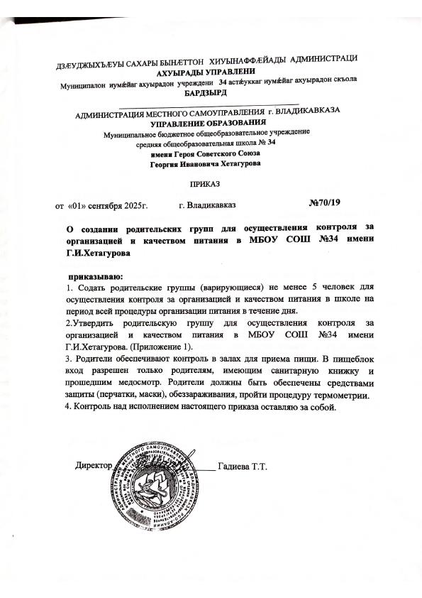 Приказ №70/19 от 01.09.2025 "О создании родительских групп для осуществления контроля за организацией и качеством питания"
