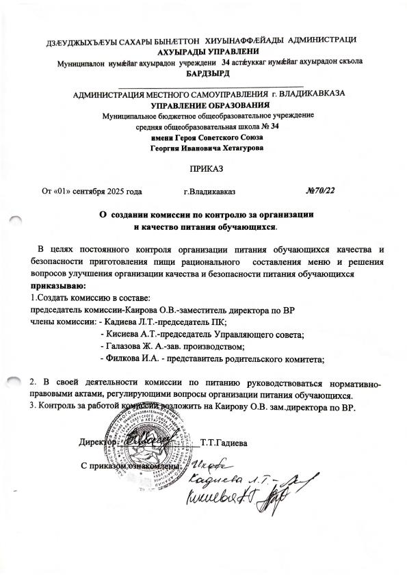 Приказ №70/22 от 01.09.2025 "О создании комиссии по контролю за организацией и качеством питания обучающихся"