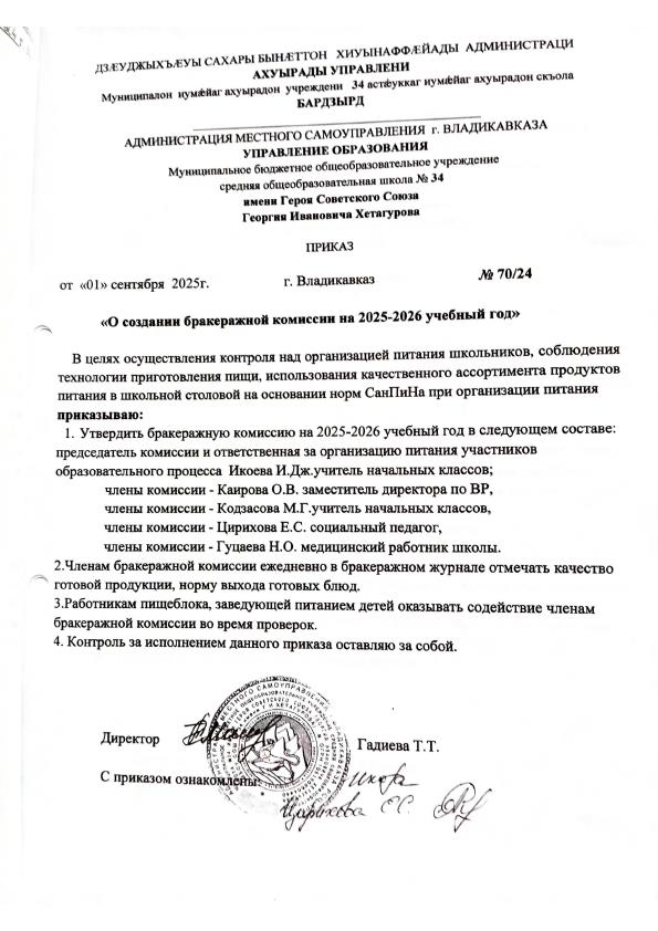 Приказ №70/24 от 01.09.2025 "О создании бракеражной комиссии на 2025-2026 учебный год"